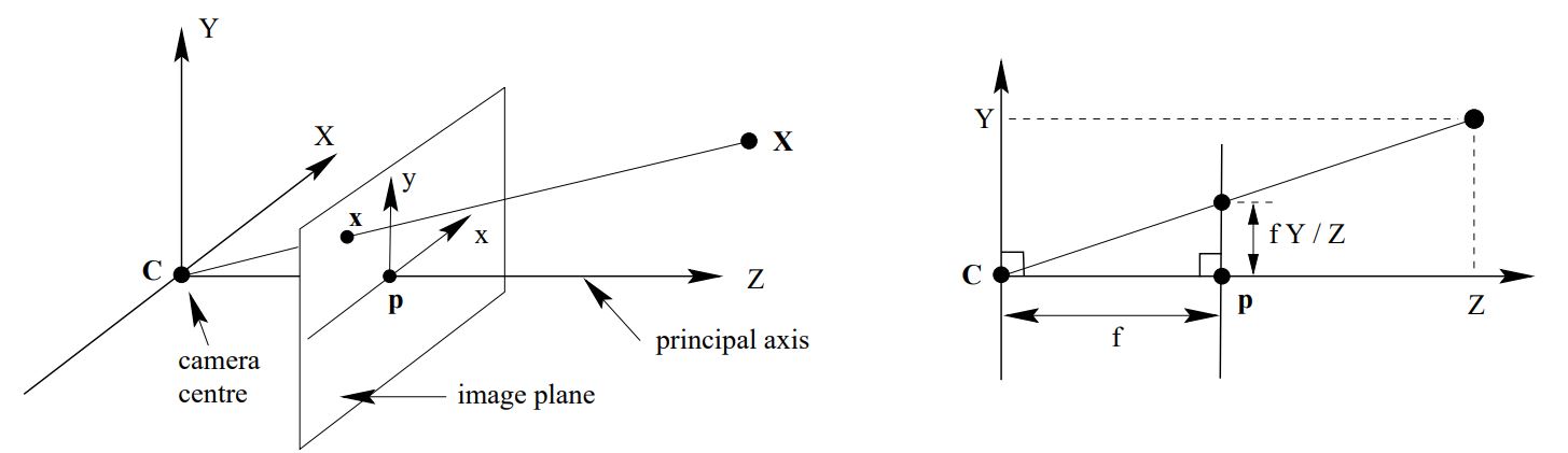 Pinhole camera geometry 여기에서는 공간 내의 점들의 평먼 상의로의 central projection을 다룬다. Projection의 중심을 Euclidean coodrinate system의 origin으로 두고 image plane(focal plane)을 $z=f$라고 한다면 공간상의 점 $\textbf{X}=[X \ Y \ Z]^T$는 다음과 같이 image plane으로 mapping된다.