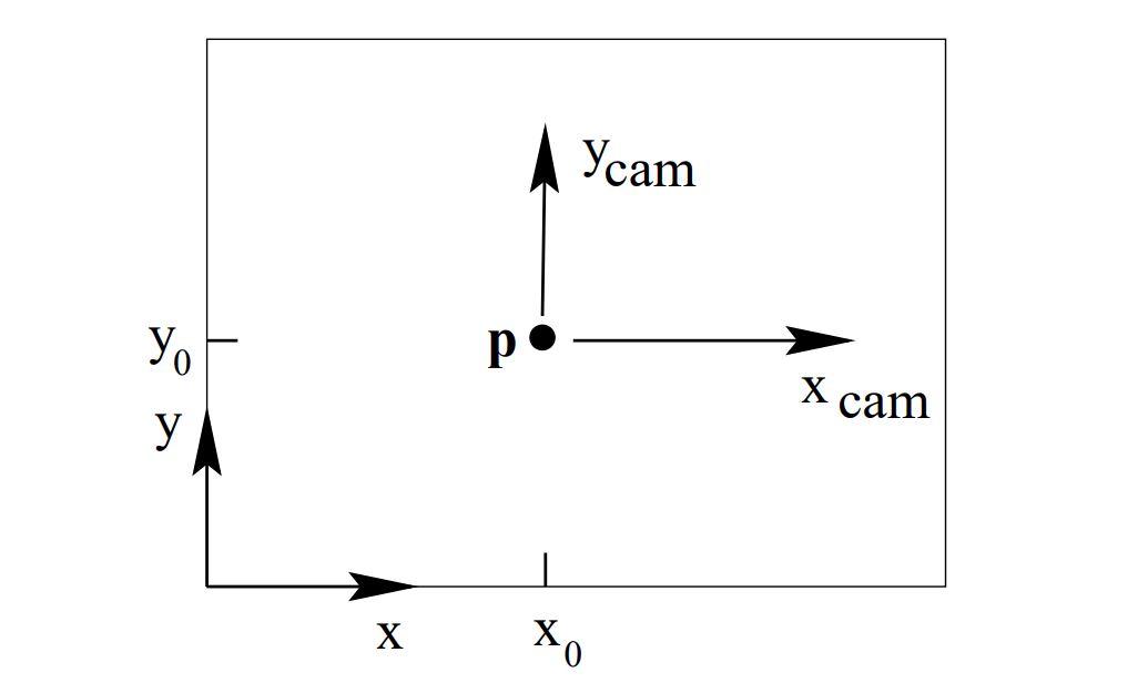 Image $(x,\ y)$ and camera $(x_{cam}, \ y_{cam})$ coordinate systems (2)의 수식은 image plane의 origin이 principal point에 있음을 가정하였다. 여기에서는 좀 더 일반적으로 이 둘이 다르다고 가정하고 위 그림에서와 같이 image plane 상의 principal point의 좌표를 설정하고 다음과 같이 projection 수식을 전개한다.