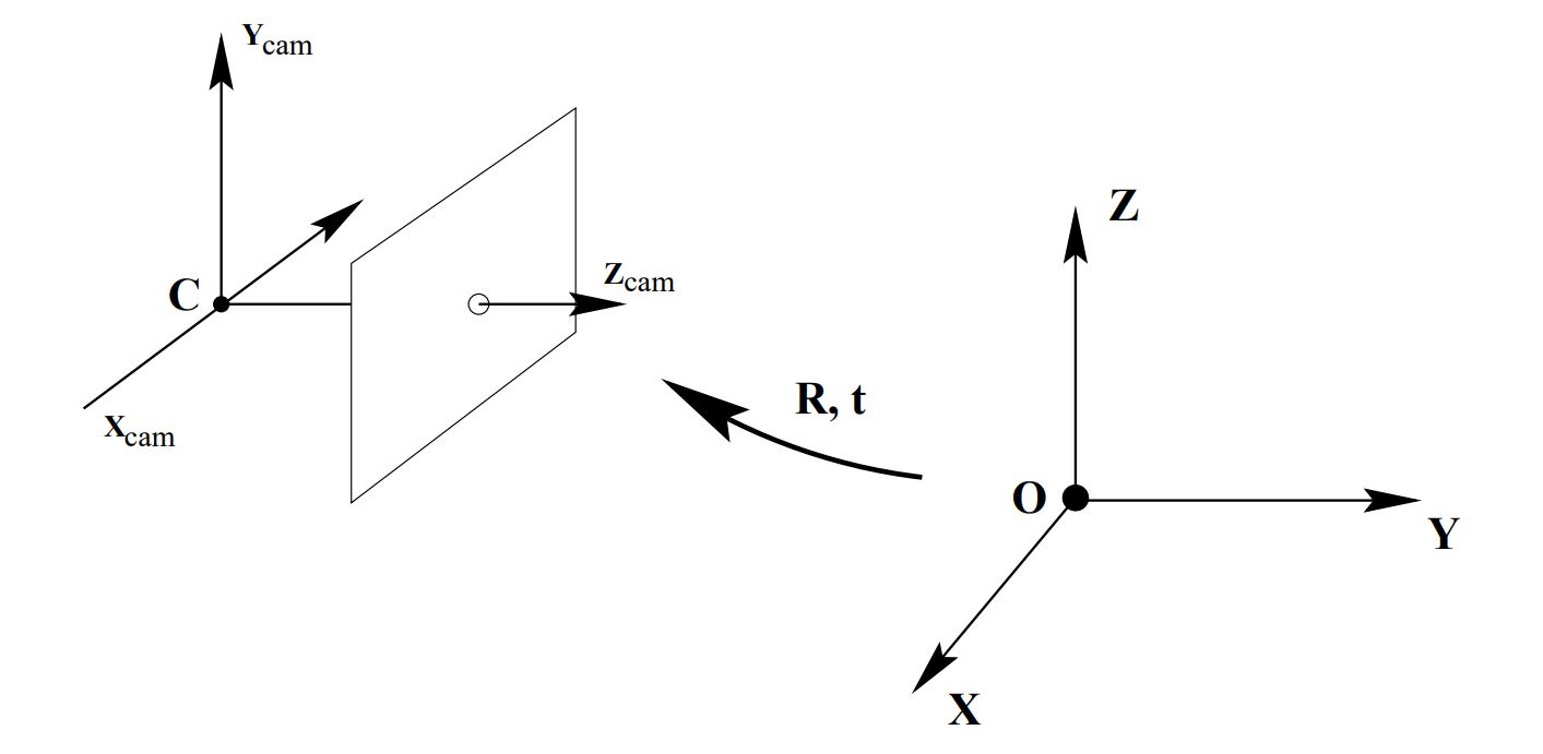 $$ \tilde{\textbf{X}}_{cam} = R \tilde{\textbf{X}} + \textbf{t} $$