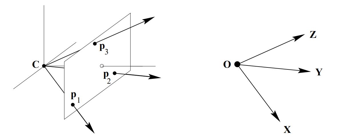 이 projection matrix의 column vector들은 각각 world coordinate에서의 축방향 vanishing point를 의미한다. 예를 들어, $\textbf{p}_1$은 world coordinate system 상에서 X-axis 방향의로의 vanishing point이다. 이는 X-axis가 $\textbf{D} =[1 \ 0 \ 0 \ 0]^T$라는 direction vector로 표현될 때, $\textbf{p}_1 = P\textbf{D}$임을 고려해 볼 때 X-axis상의 어떤 점들은 $\textbf{p}_1$으로 projection 되기 때문이다. 즉, 공간상의 X-axis 위의 점들은 모두 $\textbf{p}_1$로 투영된다. 따라서 column vector들이 갖는 기하학적 의미는 image plane 상의 한 점이며 이는 각각 world coordinate 상의 축들이 투영된 점 이다.
