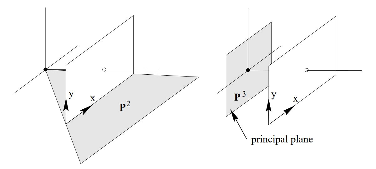 Geometric interpretation of row vectors of $P$ are the planes Column vector와 마찬가지로 row vector들도 기하학적 의미를 갖는다. General projective camera matrix P의 row vector들은 각각 기하학적으로 plane에 해당한다. 특히 3번째 row vector $\textbf{p}^{3}$은 principal plane에 해당하는데, principal plane은 camera centre를 지나고 principal axis에 수직인 plane을 의미한다. 이 평면 상의 모든 점은 image plane상에 투영되지 않는다. 이는 수식으로 이해하면 좀 더 명확하다. 어떤 공간상의 점 $\textbf{X}$가 $P$에 의해 투영되는 점이 ideal point인 경우(image plane상에 실제로 존재하지 않는, 투영되지 않는 점)를 생각해 보자. 그러면 $P\textbf{X}=[x \ y \ 0]^T$가 성립하고, 이를 만족하기 위해서는 $\textbf{p}^{3T} \textbf{X} = 0$이어야 한다. 따라서 principal plane위의 점인 $\textbf{X}$는 $\textbf{p}^3$위에 존재하므로 이 plane은 principal plane이다.