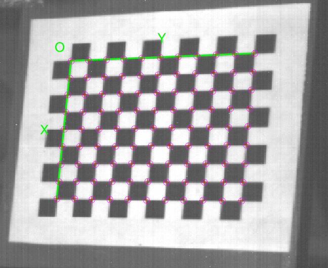 위 checker board의 그림에서 붉은 색 원으로 표시된 점을 coner point라고 한다. 이 checker board의 한 사각형의 길이를 알고 있다는 가정 하에서 가장 왼쪽 위의 coner point를 origin으로 하고 해당 plane을 $Z=0$인 것으로 설정 하여 world coordinate에서의 coner point들의 값을 알 수 있다. 즉 coner point들의 world coordinate system에서의 homogeneous coordinate 값은 $[x \ y \ 0 \ 1]^T$ 이다.