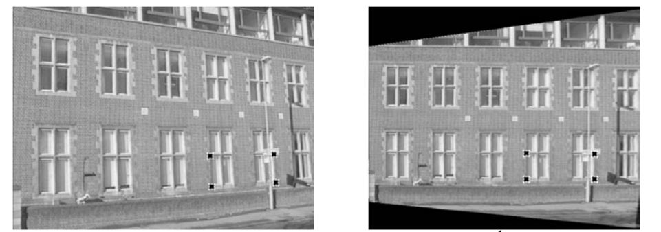예를 들어, 위 그림과 같이 왼쪽 그림에서 perspective distortion의 제거를 위해 오른쪽 그림과 같이 변환하고자 할 때 즉, $\textbf{x}' = H \textbf{x}$의 $H$를 알고자 할 때 그림에서와 같이 4개의 점 pair의 좌표를 알면 된다. 이는 다음과 같이 각 점들의 pair에서 2개의 방정식을 유도할 수 있기 때문이다.