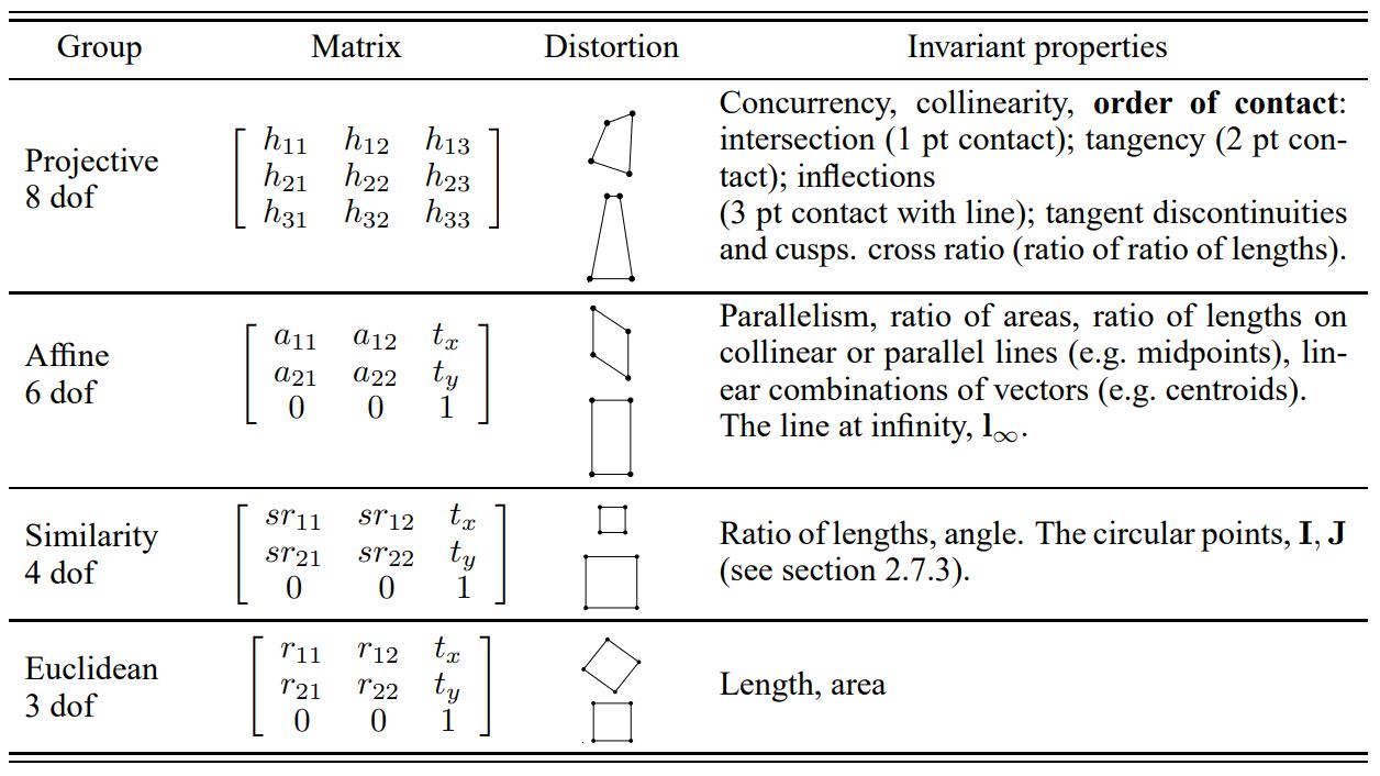 Projective transform은 $\mathbb{P}^2$에서 $\mathbb{P}^2$로의 invertible mapping $h$이며 다른 용어로 homography라고도 한다. 이 transform은 몇 가지 종류로 나누어 지고 각 종류마다 변환 이후 보존되는 값들이 존재하며 이는 다음의 표와 같이 정리된다.
