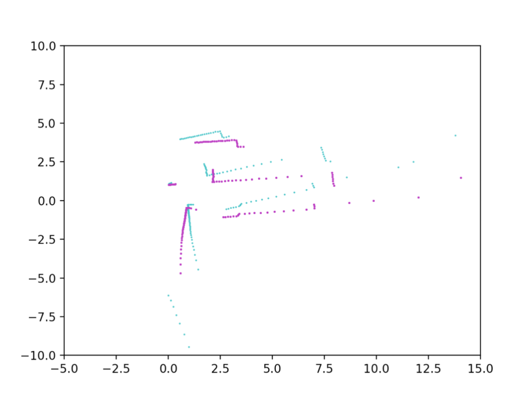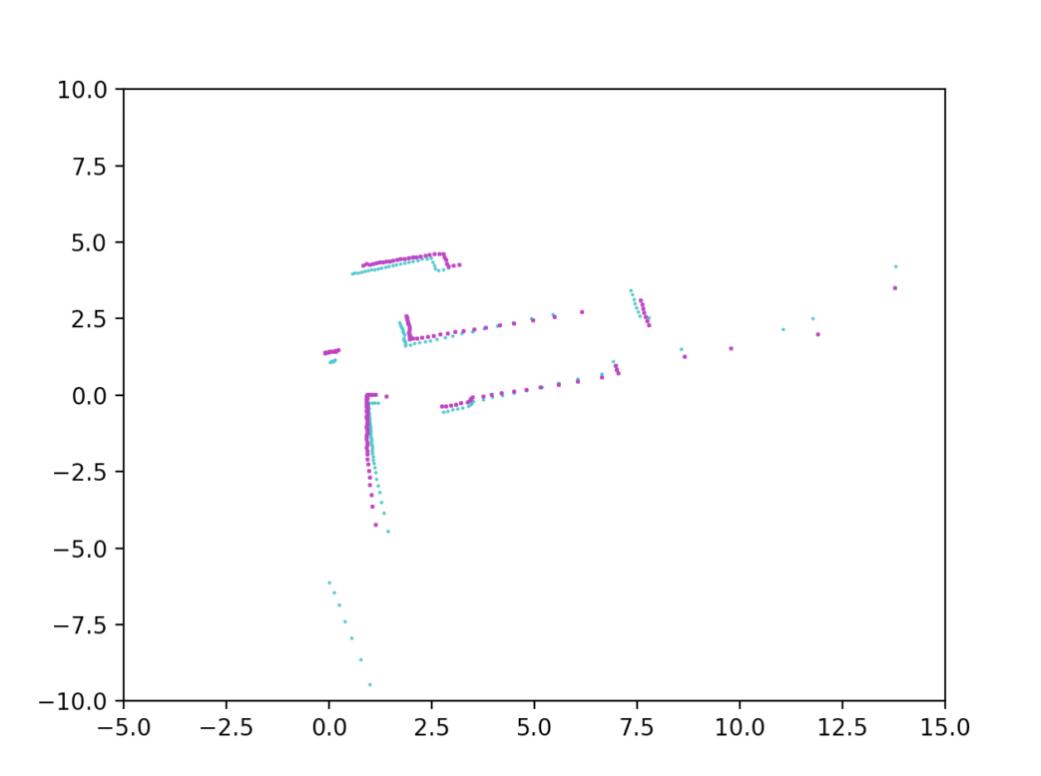 예를 들어, 그림 1의 왼쪽 그림과 같이 서로 다른 두 시점에서 2D LiDAR 센서로부터 두 점군이 얻어졌다고 해 보자. 먼저 관측된 점군을 transform (translaton + rotation)하였을 때 이후 관측된 점군과 잘 정합된다면 이 것이 두 시간 사이의 센서의 상대적 transform 이라고 추정할 수 있다.