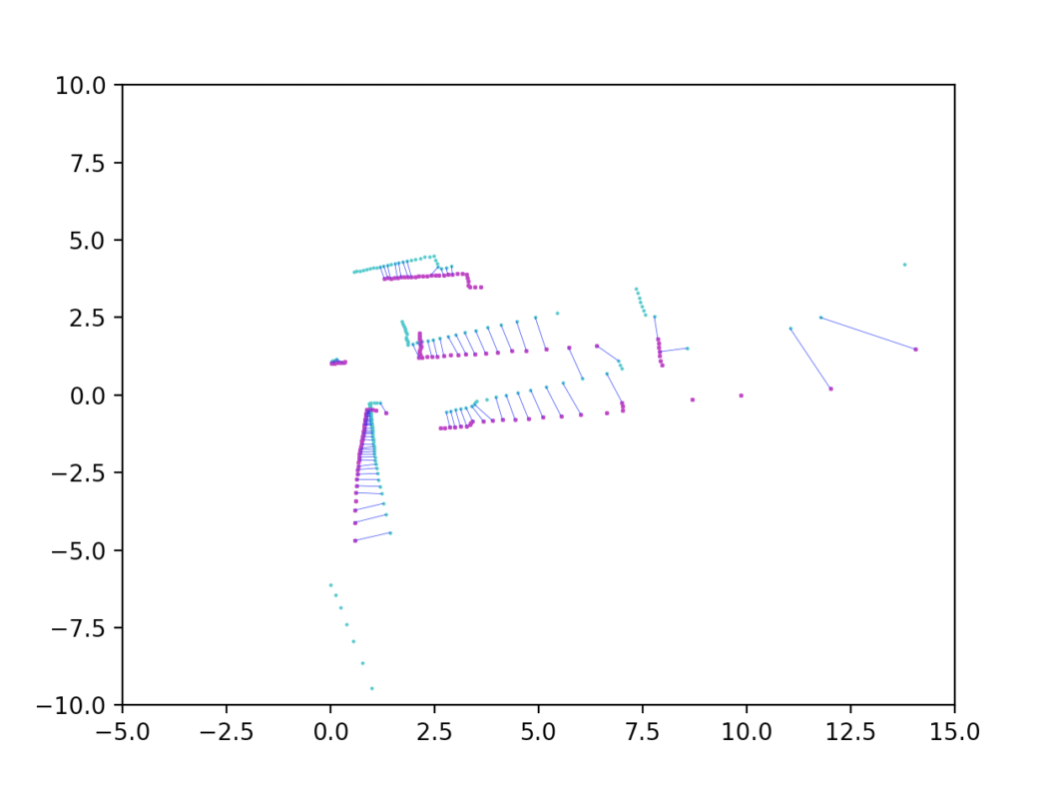 그림 1. (left) 서로 다른 시간에서 측정된 두 센서 데이터. (right) closest neighbors 두 점군 간의 상대적 transform을 구하기 위한 단계는 아래와 같다.