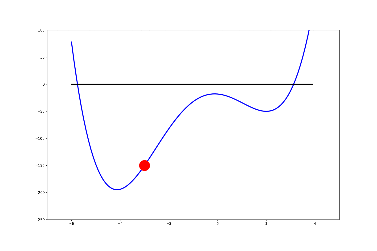 Newton method는 다음과 같은 1D 함수에서 해($x \ where \ f(x)=0$)를 찾는 방법 중 하나이다.