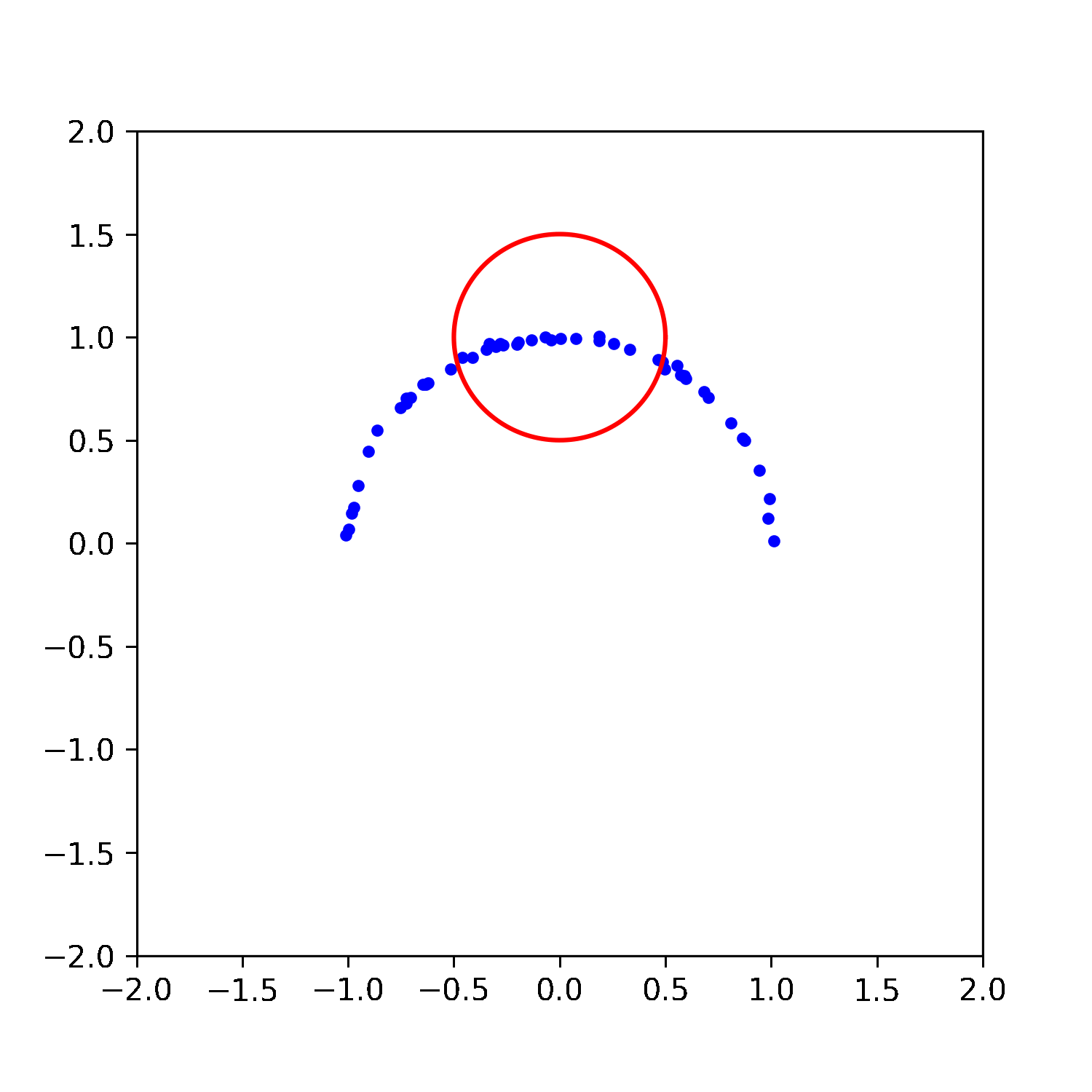 그림 1. 중심이 (0, 0)이고 반지름이 1인 원(red line)으로 부터 sampling된 반원 데이터(blue points). 평균이 0이고 표준편차가 $\sigma=0.01$인 noise를 포함한다. 그림 1과 같이 중심이 (0, 0)이고 반지름의 길이가 1인 원(red line)으로 부터 sampling된 반원 데이터(blue points)가 주어졌다고 해 보자. 원을 a, b, r의 세 개의 parameter로 정의할 때 이 데이터에 가장 잘 맞는 원은 아래와 같은 목적함수를 최소화 하는 원이다.