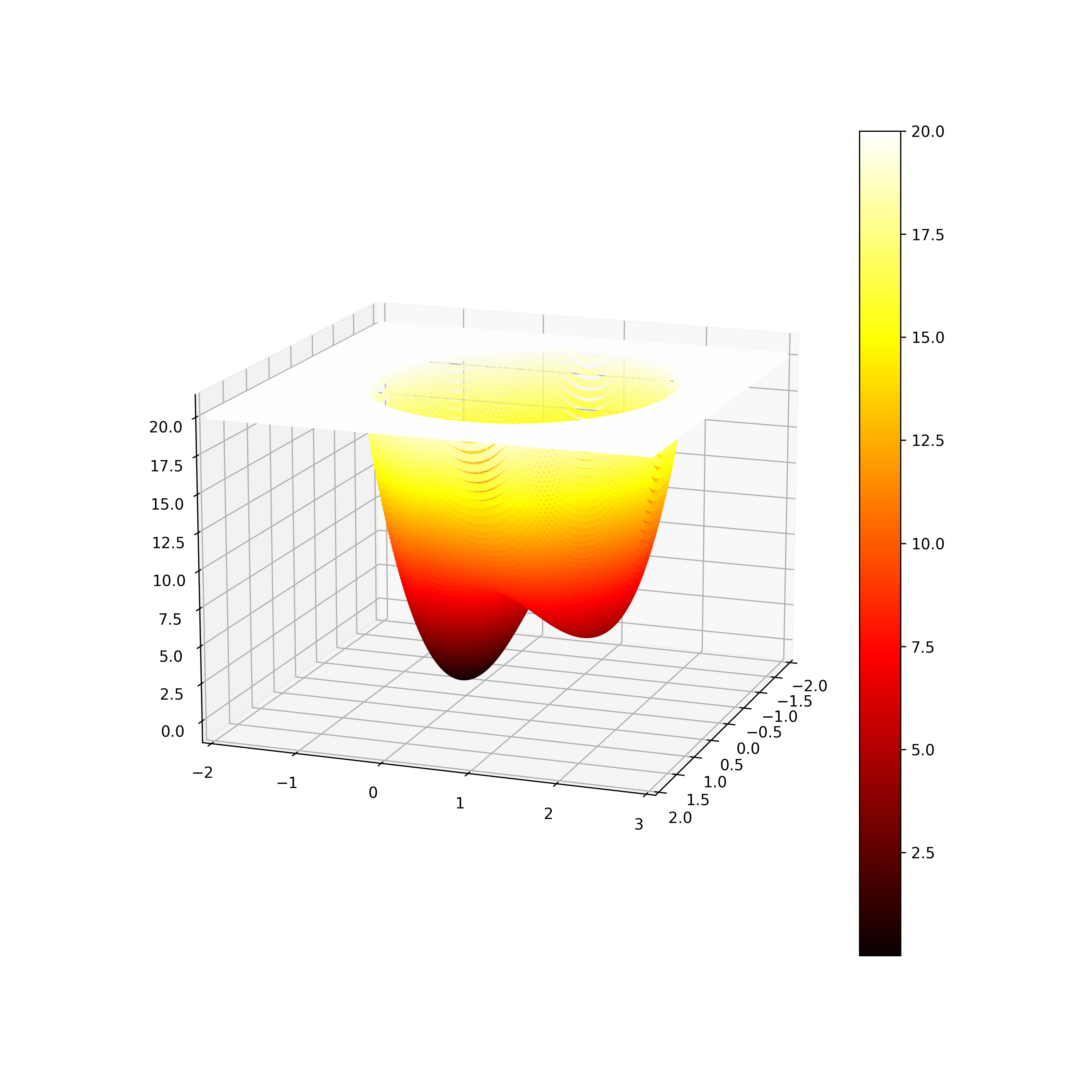 그림 2. 반원 데이터에 대한 목적함수의 가시화. 반지름을 1로 고정한 상태에서 원의 중심값 변화에 따른 목적함수 변화. 그림 2에서 확인할 수 있듯이, 이 문제에서는 (0, 0) 부근에서 global optimal이 존재하고, (0, 1) 부근에서 추가적인 local optimal이 존재한다. 따라서 더이상 목적함수의 gradient가 0이되는점이 하나임이 보장되지 않기 때문에 일반적으로 non-linear 모델의 해를 least squares 방식으로 구할때는 gradient descent와 비슷하게 iteration을 통해 수렴시키는 방법을 사용한다.